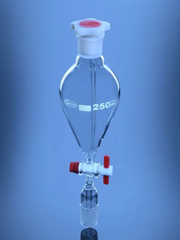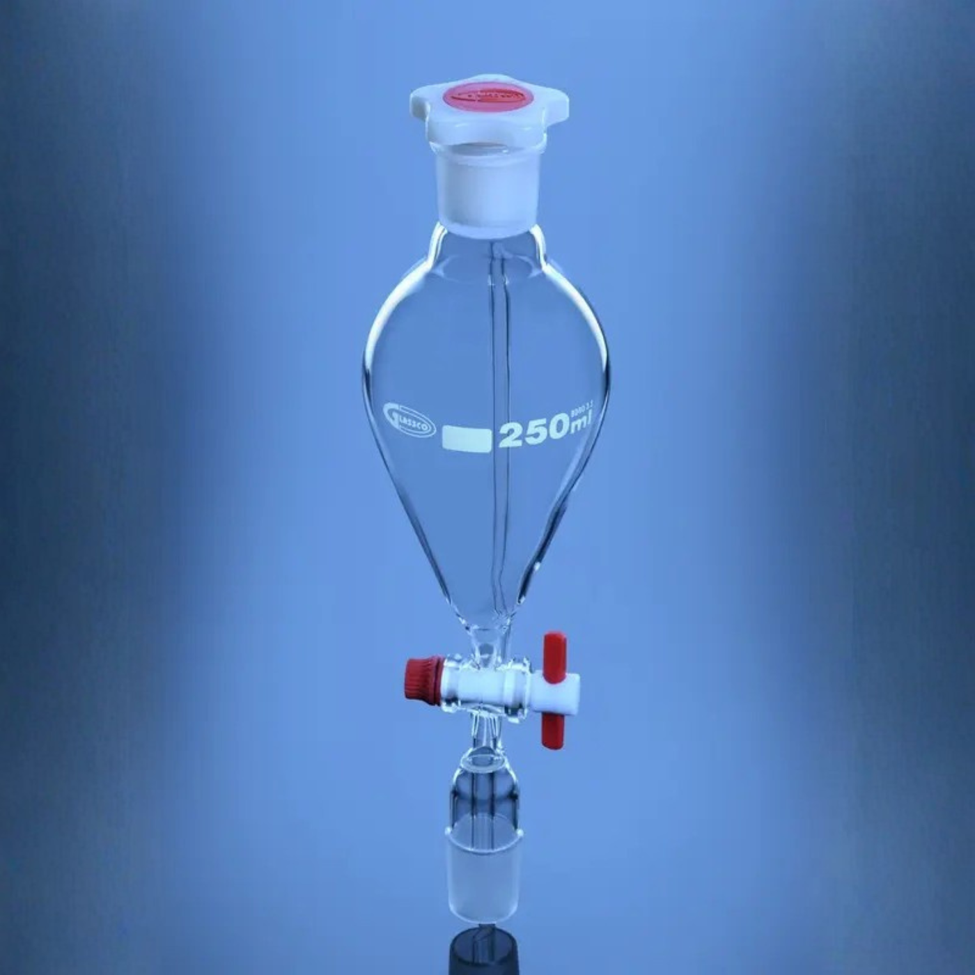This pear-shaped dropping funnel from Glassco is ideal for controlled addition of reagents where compact shape and smooth flow are required. The PTFE stopcock ensures excellent resistance to aggressive chemicals and provides reliable, leak-free operation. Made from borosilicate glass, the funnel offers durability, clarity, and thermal stability for laboratory use.