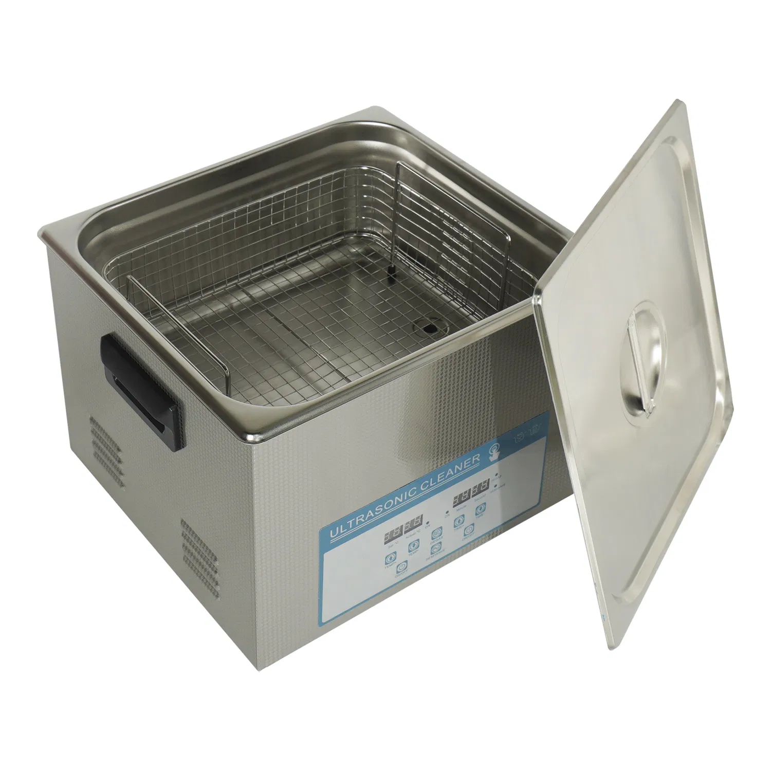 All models operate at 40 kHz and feature high-power transducers — from 1 unit on the smallest model up to 10 on the 30 L unit — delivering ultrasonic power from 80W to 600W. The stainless steel tank, shell, bladder, and cover provide durability and excellent chemical resistance. An LCD digital boot time controller and 0–30 minute timer allow precise cycle management. The waterproof design improves safety and product longevity. An optional stainless steel cleaning basket is available for all models.